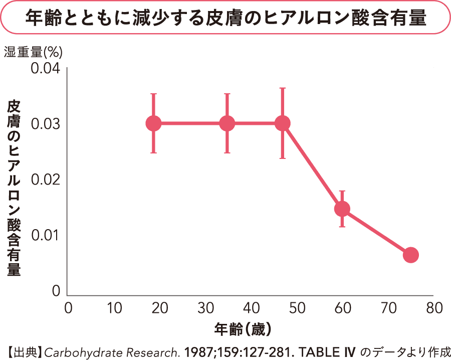 皮膚のコラーゲンとヒアルロン酸の含有量は加齢と共に減少してしまうので、意識的に補うことが大切です。「潤粋ヒアルコラーゲン」を続けて、うるおいに満ちた毎日を過ごしましょう。
